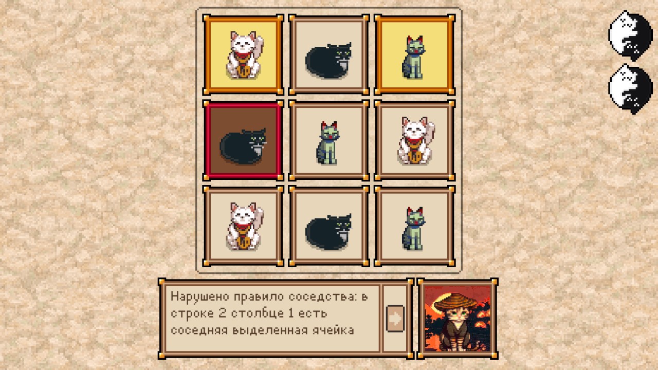 Здесь важна уникальность: в каждой строке и столбце неразделенные котики не должны повторяться. Соседство: выбранные котики не могут касаться друг друга боками. А также изоляция: все неразделенные котики должны оставаться связанными.